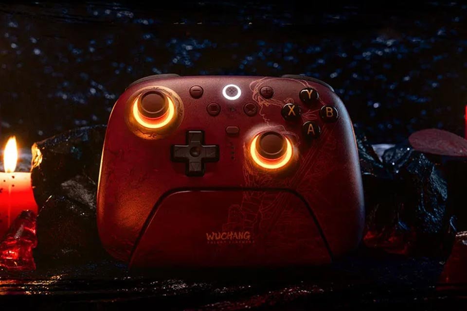 Inspirado no jogo Wuchang: Fallen Feathers, possui gatilhos extras remapeáveis, dock de recarga e iluminação RGB. Preço a partir de R$ 396,99. -