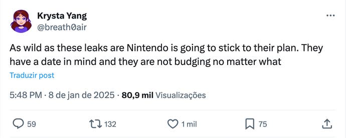 Krista Yang, que trabalhou na campanha de marketing da Nintendo Switch, comentou sobre a Nintendo Switch 2 em suas redes sociais. Segundo ela: