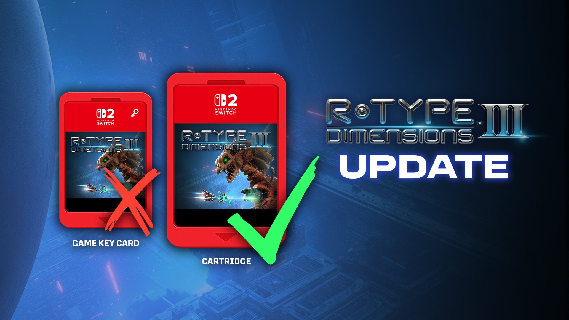 De acordo com as informações divulgadas, o jogo R-Type Dimensions 3 não será lançado como um Game Key Card. Em vez disso, os jogadores poderão adquirir o título em um cartucho que contém a versão completa do jogo. A Nintendo anunciou recentemente a introdução de dois novos tamanhos de cartuchos, que são mais compactos e, consequentemente, permitem uma reavaliação nos custos de produção, possibilitando que o jogo completo seja armazenado no cartucho.