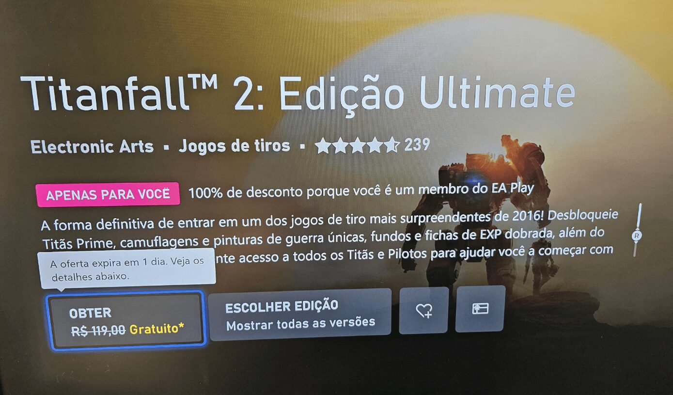 Além de estar disponível no Xbox, Titanfall 2 também pode ser jogado através do EA Play no PlayStation e PC. Na Steam, a versão padrão do jogo está com um desconto de 90%.